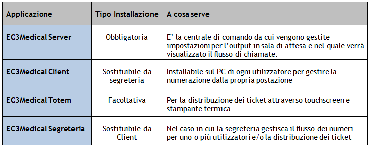 EC3Medical Segreteria può essere utilizzato in caso sia presente un’accettazione che si interfaccia con i pazienti. La segreteria, attraverso questa applicazione potrà sostituirsi al client in caso di necessità per l’avanzamento delle code e può anche gestire la distribuzione dei ticket. Inoltre gestisce eventuali urgenze, segnalando direttamente sull’applicazione client del medico una presenza inaspettata, che richiede visita. Questo tipo di segnalazione, seguirà una sua separata numerazione e potrà essere gestito dal medico per come ritiene opportuno.